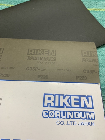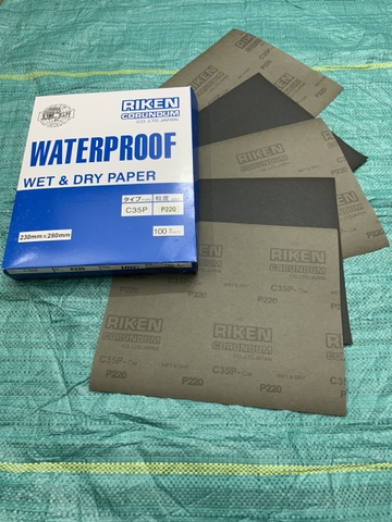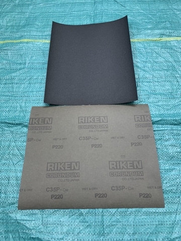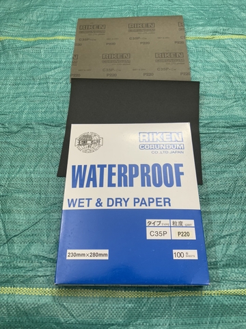 Giấy nhám chịu nước P220, hãng Riken, mã CP35, kích thước 9''x11'' màu xám, sản phẩm được sản xuất tại nhà máy RIKEN, Japan. Với chất lượng hạt cát Silicon Carbide có độ bền cao