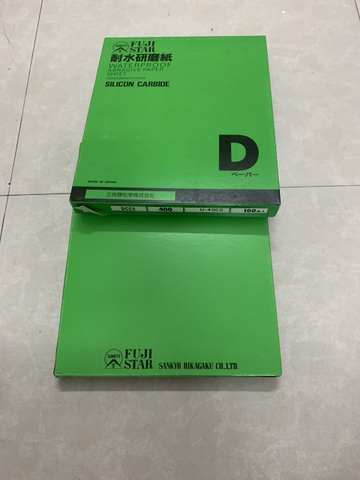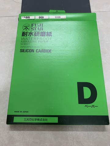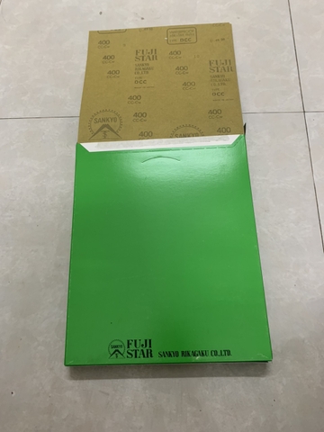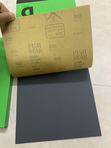 Giấy nhám Sankyo Fujistar, mã DCC, Made in jpan, kích thước 230mmx280mm được nhập khẩu từ Nhật Bản, đây là loại giấy nhám chịu nước màu đen được cấu tạo từ các hạt cát (Thông dụng là cát Silicon carbide) với các kích cỡ, độ nhám khác nhau và được sắp xếp theo tỉ lệ nhất định trên bề mặt giấy, đáp ứng đầy đủ các yêu cầu mài mòn vật liệu